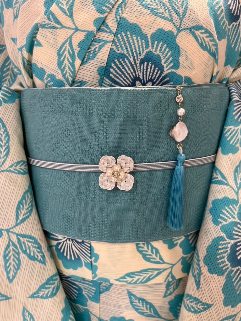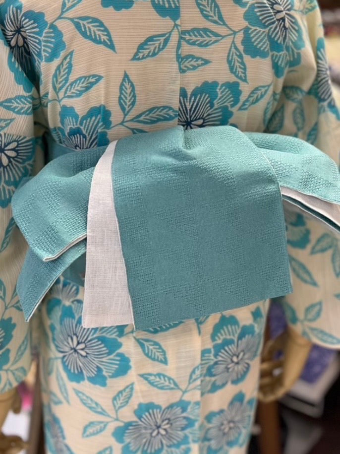 帯は毎年好評いただいています、ふんわりと立体感のある半巾の文庫結びにかぶせを付けたタイプと、半巾帯をお太鼓風にアレンジした造り帯をご用意!