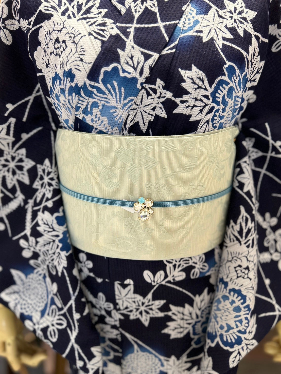 帯は毎年好評いただいています、ふんわりと立体感のある半巾の文庫結びにかぶせを付けたタイプと、半巾帯をお太鼓風にアレンジした造り帯をご用意!